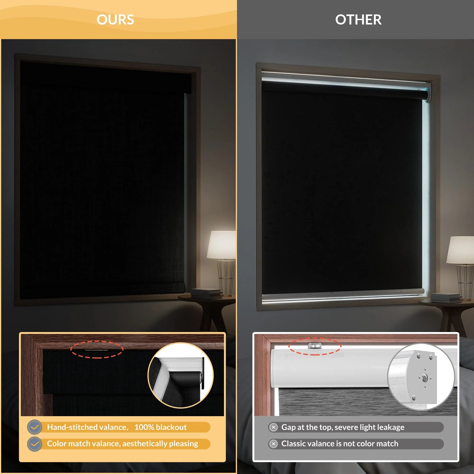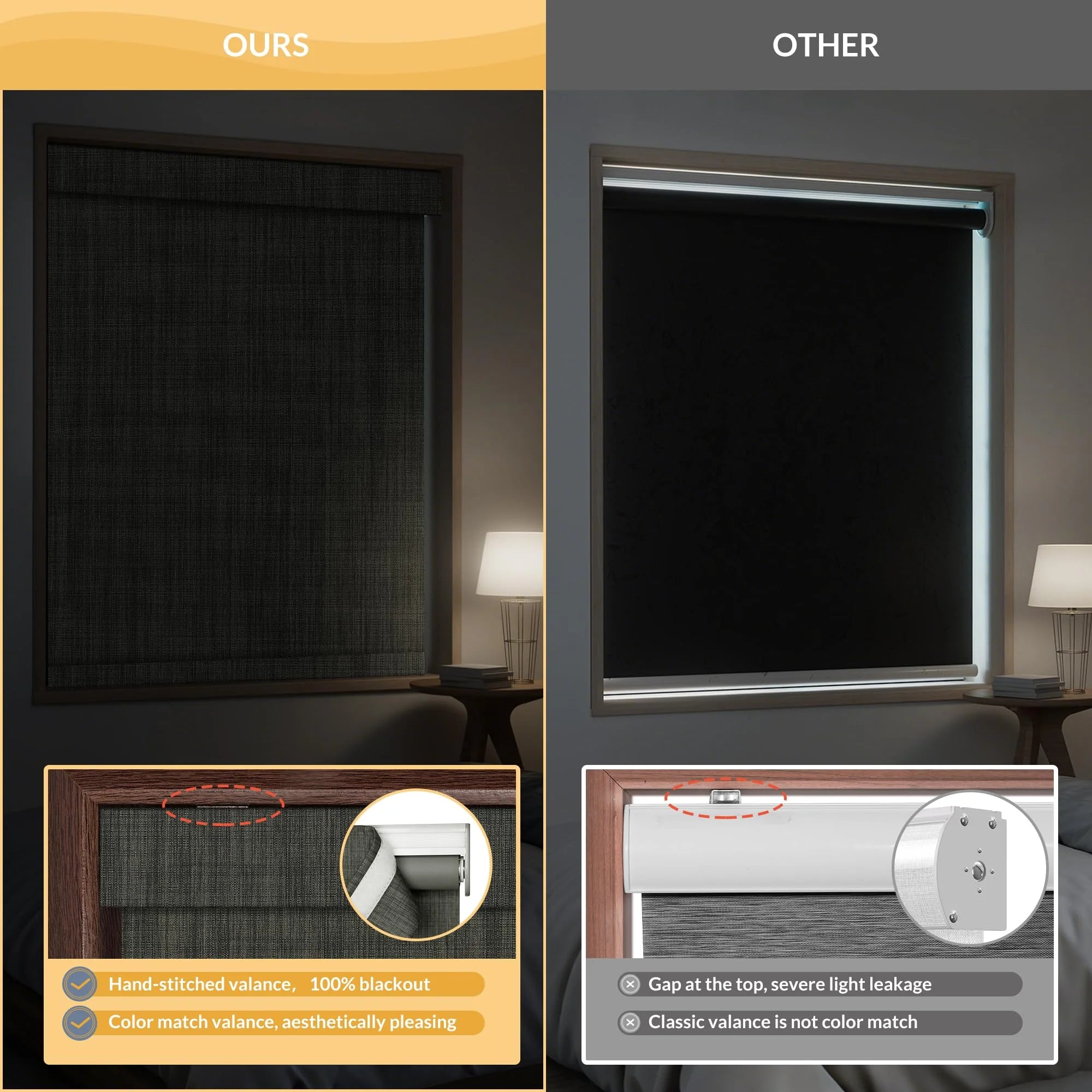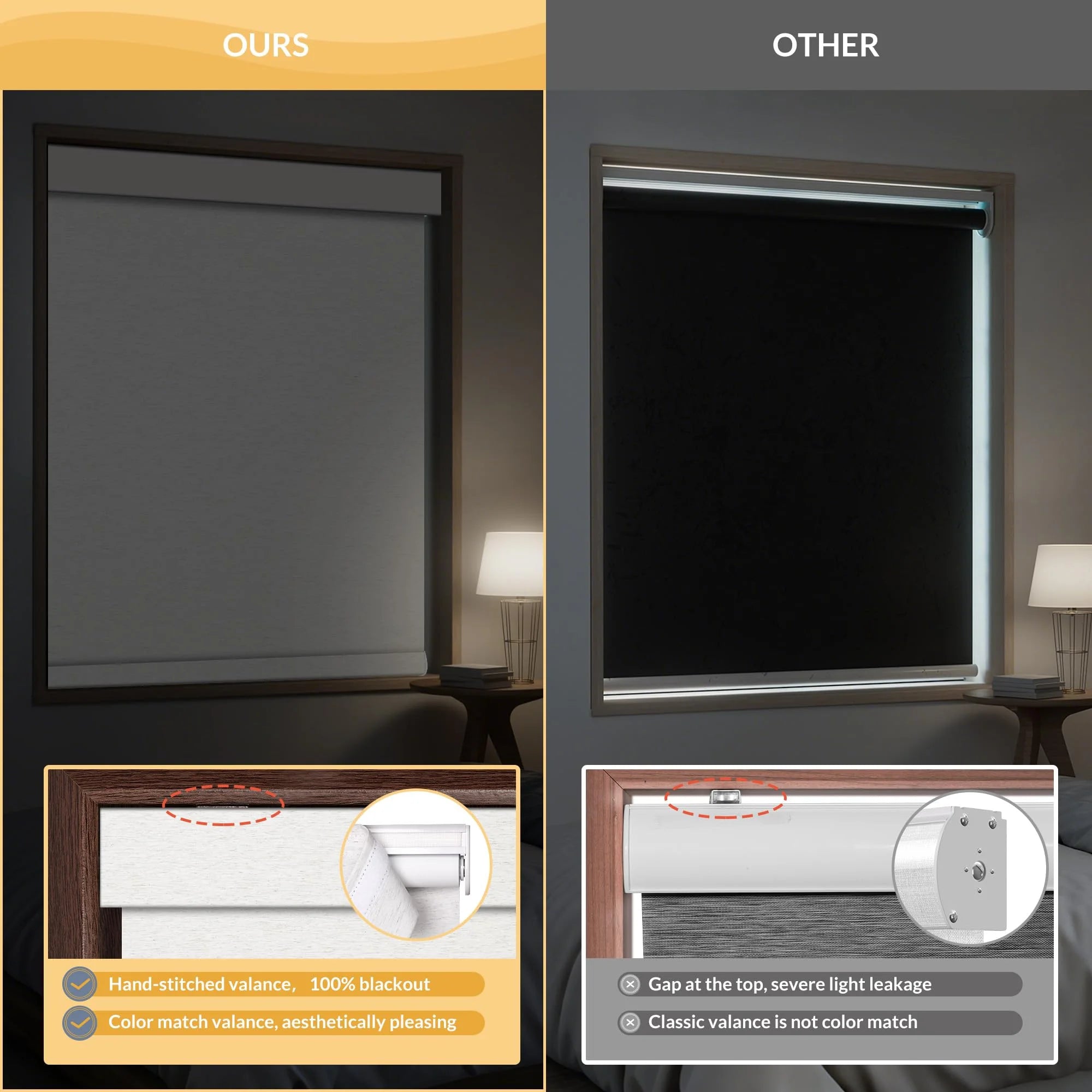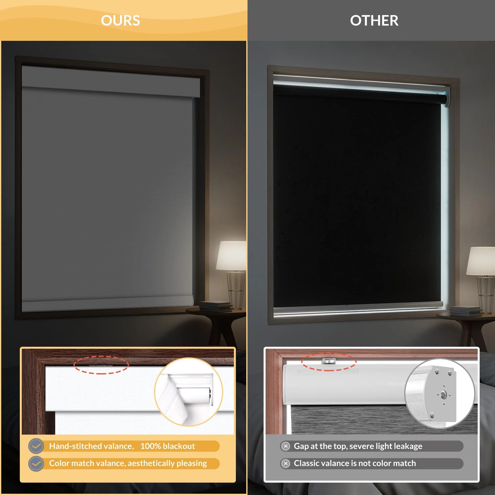 Our upgraded headrail fits tighter to reduce light leakage and looks more finished, while typical shades leave visible gaps and let light in.