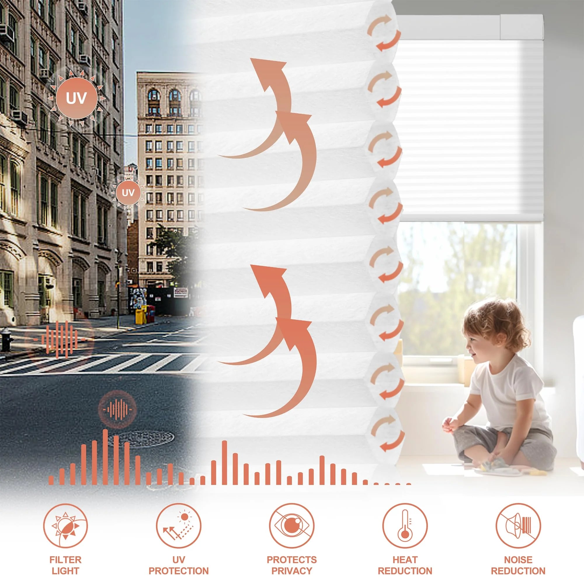The unique hexagonal honeycomb structure effectively insulates, reducesnoise, and cuts energy costs by blocking heat and retaining warmth